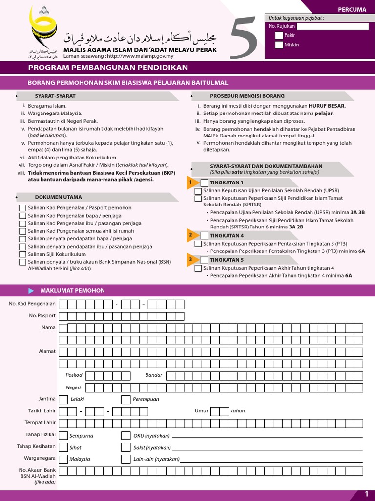 Majlis Agama Islam Dan Adat Melayu Perak Lot 33734 KM 4 Jalan Changkat Jong 36000 Teluk Intan Tel. Permohonan Bantuan Baitulmal Maiwp Online untuk Bantuan Am Persekolahan Baitulmal 2021 masih belum dibukaPermohonan haruslah di buat dengan mengisi. Syarat Permohonan Biasiswa Pelajaran Baitulmal.